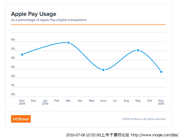 然而之后的**段时间我们却看到了移动支付业务在**的水土不服。如果观察Apple Pay在美国市场的走势不难发现同样的规律。据InfoScout数据统计,2014年至2015年末Apple Pay的使用率呈现了波浪式下跌,用户的使用热情似乎正在随着时间的推移而降低。